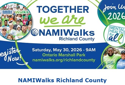 Join NAMI Richland County for NAMI-Walks 2026. This year’s national event will be held on Saturday, May 30, 2026, and participants will meet at Marshall Park in Ontario by the lower soccer fields (3375 Milligan Road). Pre-register online at www.namiwalks.org or same-day registration begins at 8:00am at the event. The race includes an opening ceremony at 8:50am and participants can choose to run in either the 1 Mile Fun Run or the 5K run. Swag bags available for 5K participants only while supplies last. For more information about the event including possible sponsorship opportunities and how to donate, please contact NAMI Richland County at 419-522-6264 or by emailing families@namirc.org. See you there!