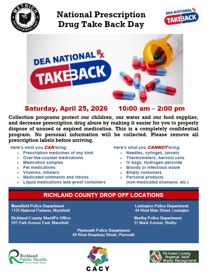 The METRICH Drug Enforcement Unit, in partnership with CACY Ohio, local law enforcement, and other county departments, are providing a Medication Take Back Day event being held at multiple locations throughout Richland County. Please refer to the event flyer for a list of participating locations and the items that CAN and CANNOT be disposed of at this event. No personal information will be collected. Be sure to inspect medication containers for identifying labels and remove any identifying information.